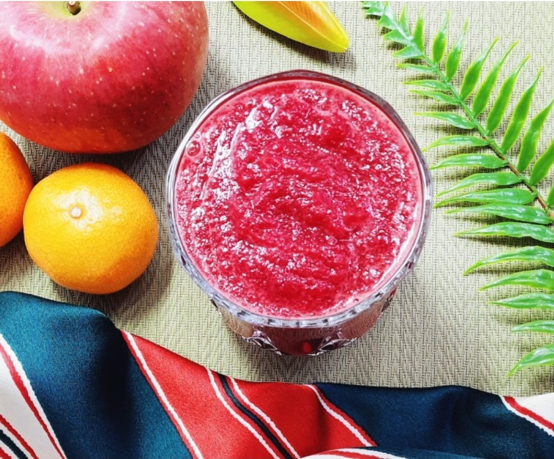 그럼 비율대로 발맞추어 준비한 사과, 당근, 비트를 믹서기에 다같이 넣고 갈아준답니다. 이 때에 취향에 따라서 물과 얼음 등을 나란히 넣어서 갈아도 되었는데, 약간 뻑뻑하게 먹더라도 과일과 채소들만 넣어서 드시는 것을 더 권유하는 편이예요. 비트를 적게 넣는 또 다른 이유가 있다고 하는데, 비트는 옥살산이라 하는 성분 때문에,
